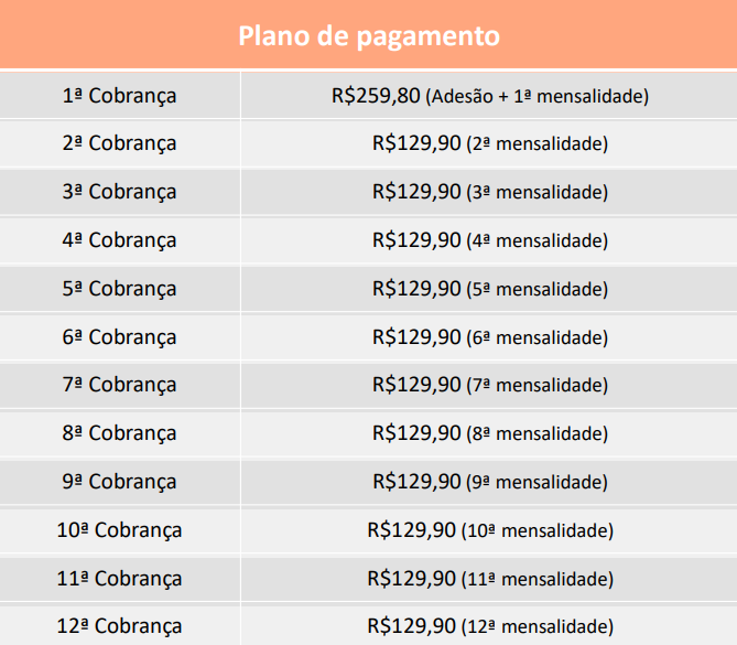 Uma cobrança é gerada a cada mês. Em 1 ano você terá pago R$ 1.688,70 sem comprometer o limite do seu cartão com este valor.